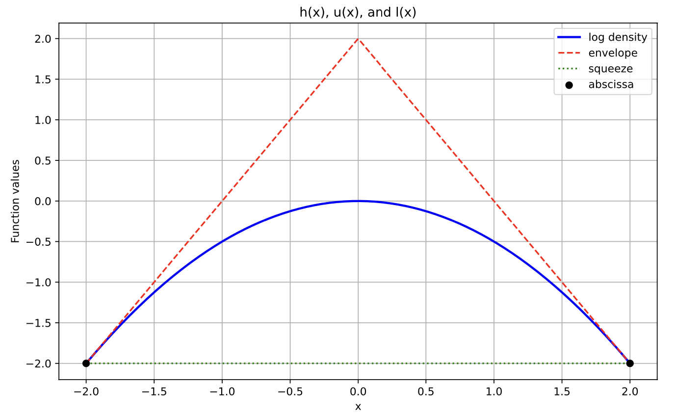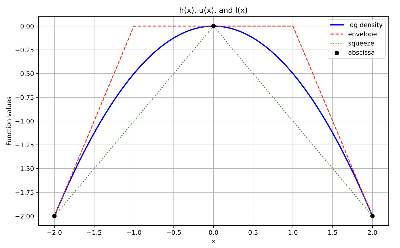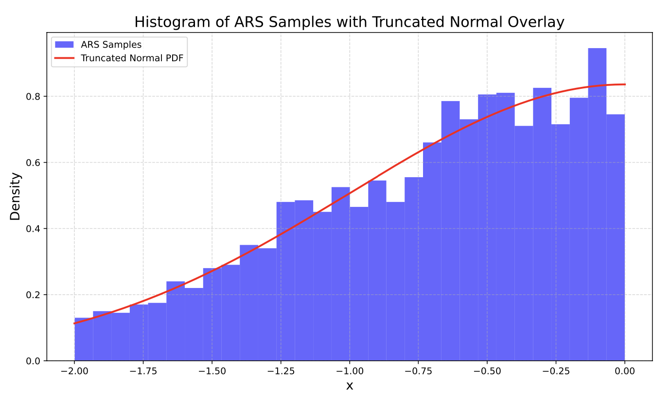 Adaptive rejection sampling is a computationally efficient algorithm that allows sampling of log-concave probability density functions. Like the name suggests, ARS is relatively similar to rejection sampling except we can manipulate the log-concavity to create “squeeze” and “envelope” linear functions that limit both the number of samples we have to throw away and the number of evaluations of our probability density function. This can be particularly useful in cases where evaluation of the pdf is expensive and when sampling a truncated distribution.