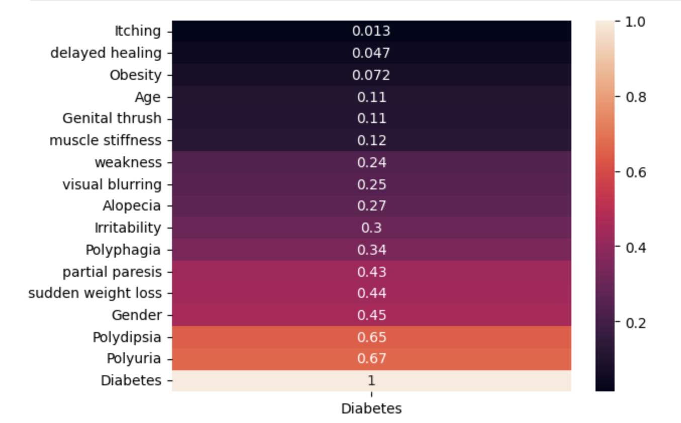 sns.heatmap(df.corr()['Diabetes'].abs().sort_values().to_frame(), annot=True);